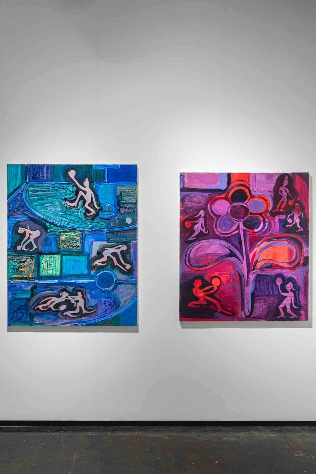 Bergart’s visual language is informed by popular culture, art history, feminist theory, textile traditions—researched during her Fulbright Scholarship in Ghana—as well as her own experience as an athlete. Her paintings and drawings are defined by saturated color and layered, speckled surfaces developed through a controlled yet intuitive process. Works on view articulate two primary modes: geometric abstractions that echo the lines and spatial logic of courts and athletic fields, and patterned grounds animated by silhouettes of women athletes. Rejecting hierarchy and illusionistic depth, Bergart composes open, charged images that reflect the agency, rhythm, and exuberance of play.