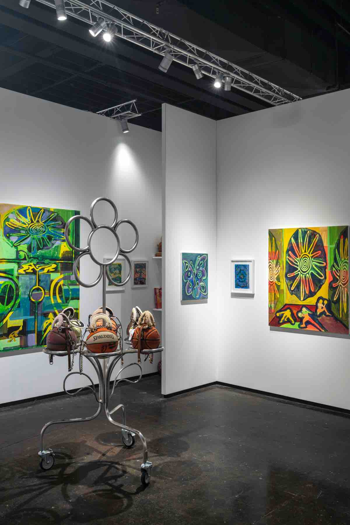 A new sculptural work anchors the booth: a reimagined basketball rack fabricated from polished stainless-steel tubing. Holding six balls and culminating in a stylized flower—a form seen across Bergart’s work—the piece operates both as display and sculptural intervention, reframing athletic equipment as an object of aesthetic consideration. Resting atop the rack, a rotating selection of Bergart’s signature basketball bags, crafted from vintage balls marked by real use, extend the work into the realms of design and social performance. The bags offer an immediate entry point for viewers who may connect first through a wearable object, and act as carriers of narrative, circulation, and memory.